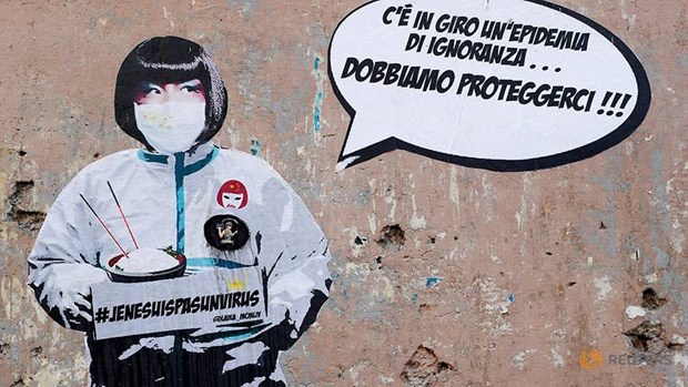 Một tấm poster phản đối kỳ thị người Trung Quốc vì dịch COVID-19 được dán trên bức tường ở Rome, Italy (Nguồn: Reuters)